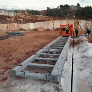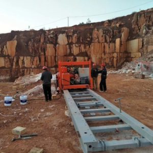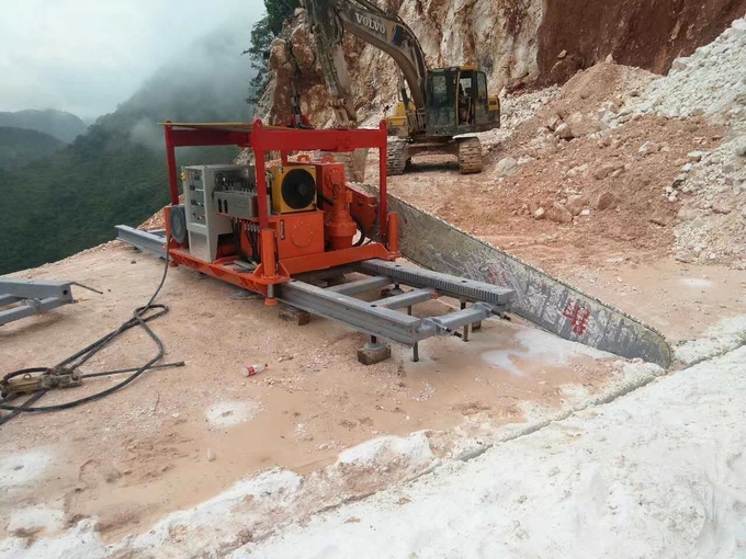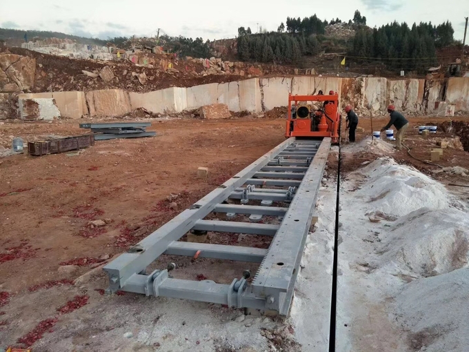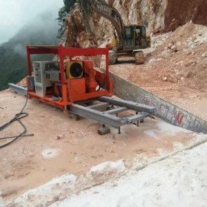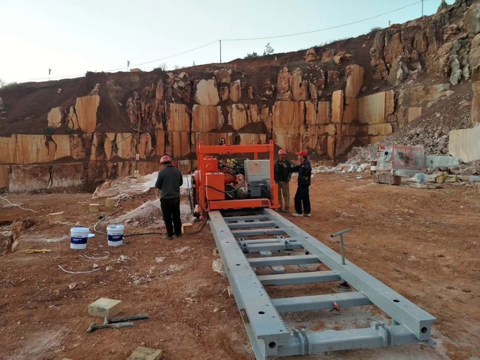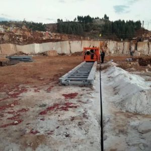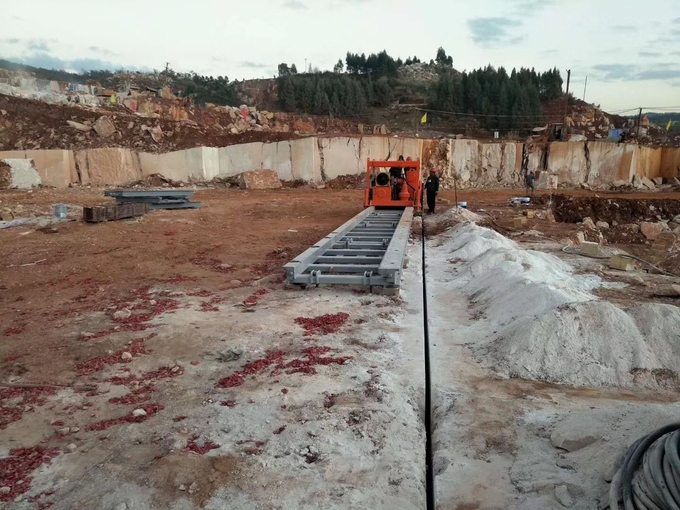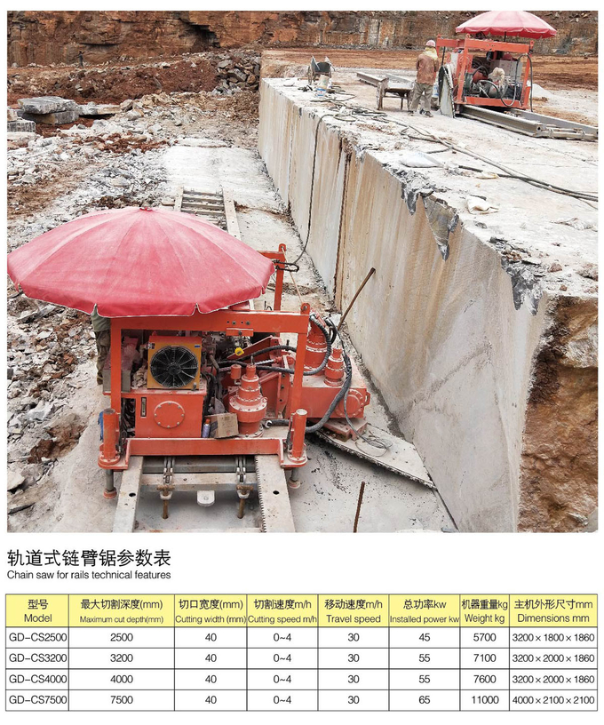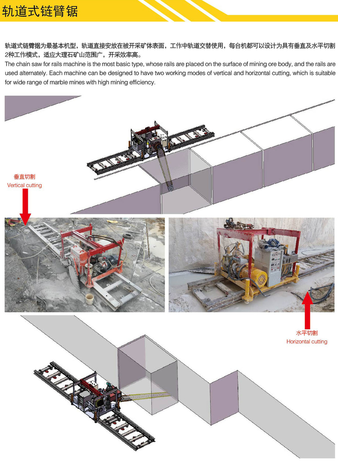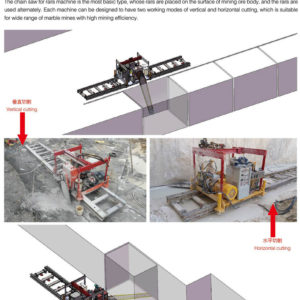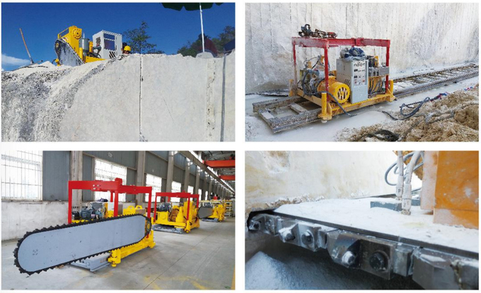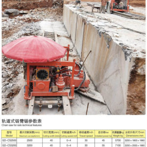 Chain arm saw machine is also called chain saw machine, chain arm saw cutting machine and band saw. It is a kind of stone cutting machine designed to achieve continuous cutting of stone by the rotation of diamond hot pressing joint block, diamond composite sheet or cemented carbide head embedded in the chain. It is suitable for cutting marble and limestone with medium hardness in the face stone mining. The combination of chain arm saw and diamond wire saw machine will play a good role in marble mining. In the actual stone mining, the main function of the chain arm saw is to cut the block material from the ore body in the marble mining, and divide the large block into the standard one. There are three types of marble chain arm saw machine: rail type chain arm saw machine, craw type chain saw machine, underground type chain saw cutting machine.