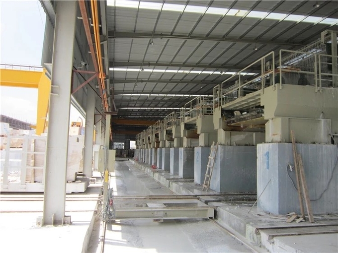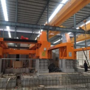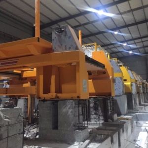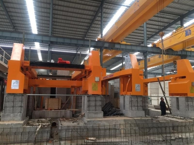 It is one of the two mainstream equipments in the production of large-scale stone plate that the high-efficiency processing equipment of medium and hard marble, sandstone, synthetic stone and so on can be obtained. characteristic: 1. Adopt table lifting feeding mode for sawing, frequency conversion drive 2. The saw frame can be assembled with 80 diamond saw blades 3. Static pressure circular guide rail structure is adopted for reciprocating swing of saw frame 4.Low power consumption 5. Variable frequency drive 6. It adopts double crank and double connecting rod structure 7. The specification of raw materials shall not be greater than 3250 * 2000 * 2000mm