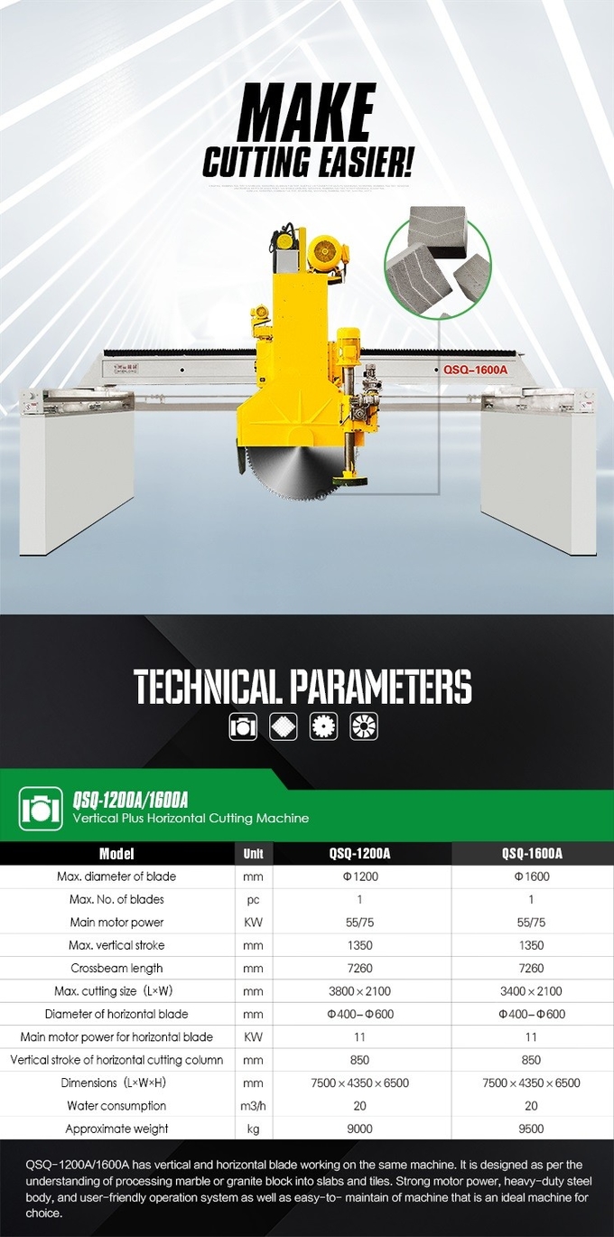This machine Fast Cutting Vertical Horizontal Stone Cutting Machine for Marble, Stone Design Cutting Machine for Marble has vertical and horizontal blade working on the same machine. It is designed as per the understanding of processing marble blocks into slabs and tiles. Strong motor power, heavy-duty steel body, and friendly operation system as well as easy to maintain maintan.