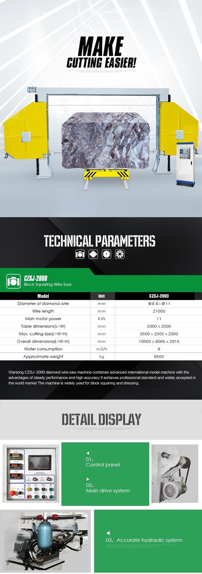 CNC-2000 Diamond Wire Saw Block Cutting Machine combines advanced international model machine with the advanced steady performance and hihg accuracy. It achieves professional standard and widedly accepted in the world. The machine is widely used for block suqarring and dressing.