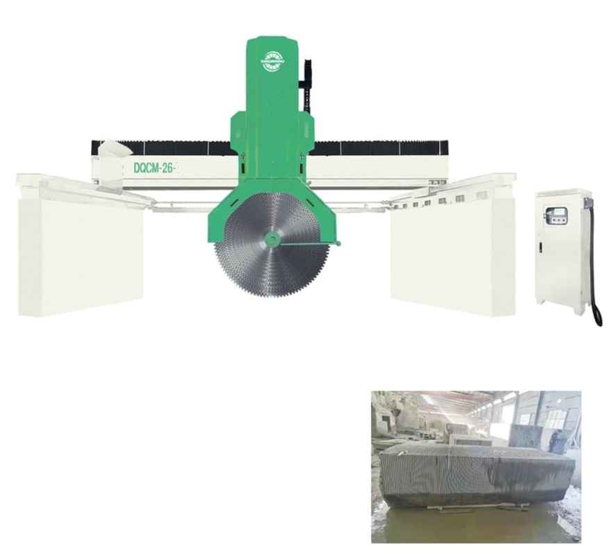 DQCM Dual Drive Heavy Duty Block Cutting Machine, adopts our patented dual-drive mode (one pull and one push) for moving left and right, adjust the moving speed according to the material. Cooperating with the Dual V- track beam track makes its moving more stable. The lifting uses hydraulic with four guide post made of 200mm solid round steel chrome-plated. Forward and backward adopts screw drive and double nut drive, and cooperate with the oil-immersed sidebeam rail, which is more wear-resistant. It adopts longer and heavier casting beams so it can cut more stable. Main parts adopt imported materials. The stone blocks can be placed in the ground directly to save a worktable and its maintenance costs. Therefore the whole machine is featured as high cutting eficiency, high slicing precision, flatness of plate after cutting, high stability, easy-operating to suit specially cutting granite block.