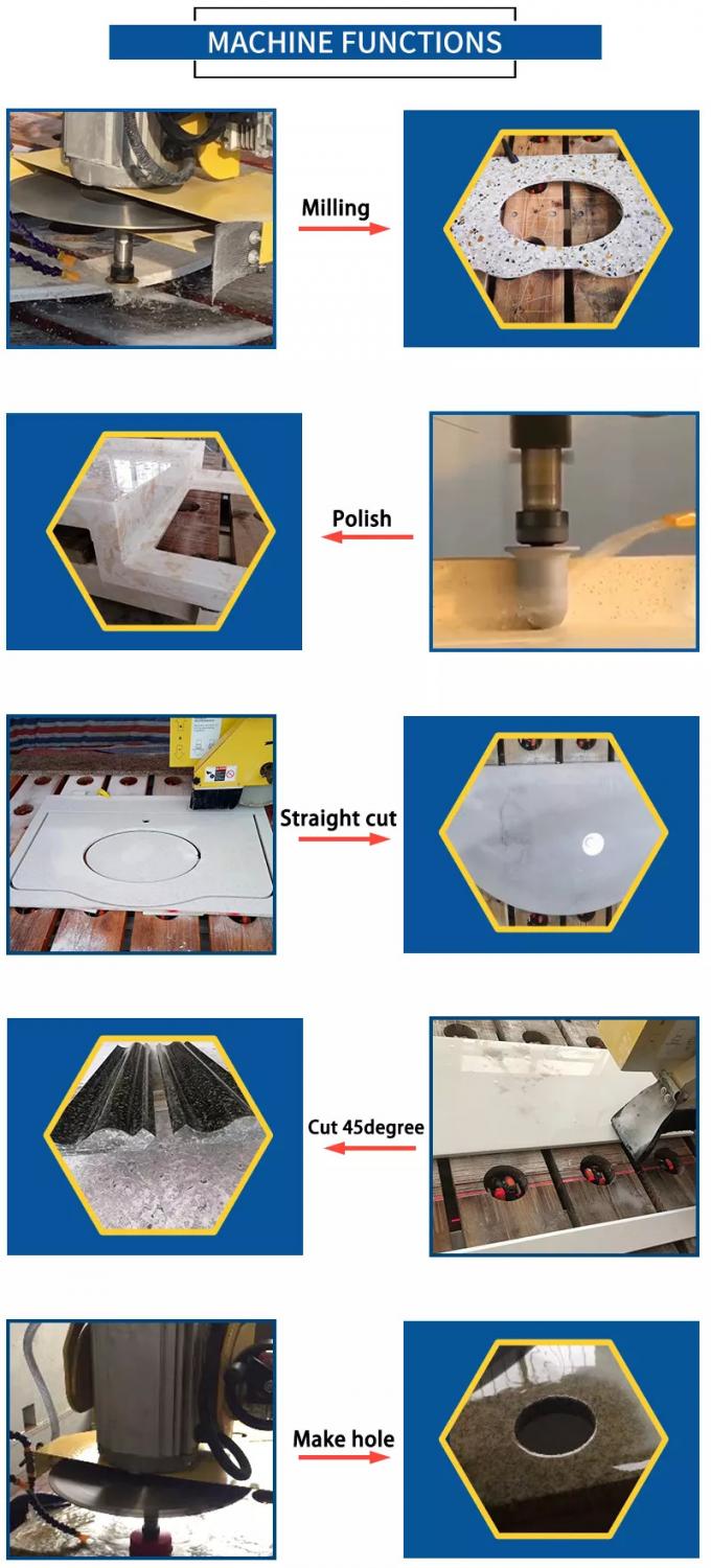 Multi-functions: Cutting straight and 45 degree, Polishing, Edging, Grinding, Making hole.With Camera, tilting table.